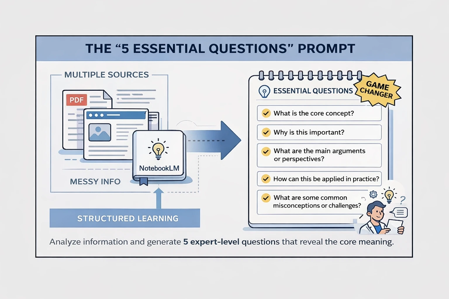 Why It Works: Forces structure. Instead of dumping information, NotebookLM identifies what actually matters and frames it as questions you'd ask an expert.