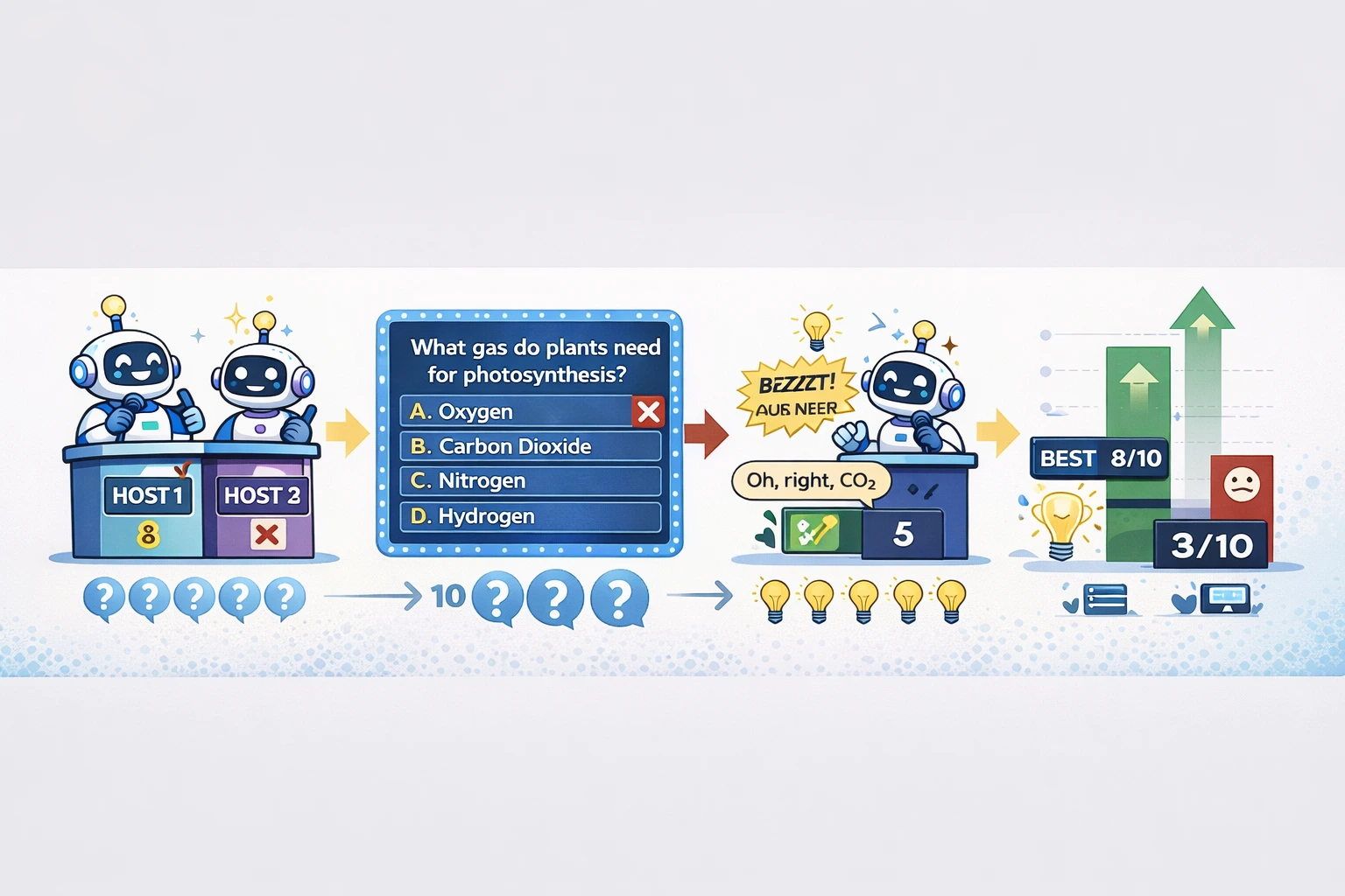 A quiz show with two hosts. First host quizzes the second on [TOPIC]. 10 questions total. Mix of multiple choice and True/False.