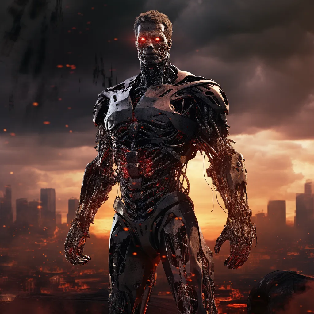 Imagine it is 2193 and create a scene inThe Terminator’s style of a battlefield where robots and cyborgs clash in an intense war for control of the world. A single figure in a gleaming metal exo suit towers over the chaos and brandishes a massive plasma cannon.