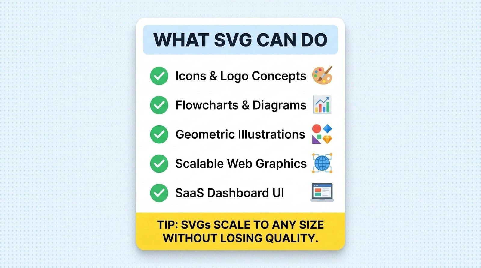 SVGs are perfect for icons, logo concepts, simple illustrations, flowcharts, and geometric designs. They scale to any size without losing quality. That makes them genuinely useful for business applications.