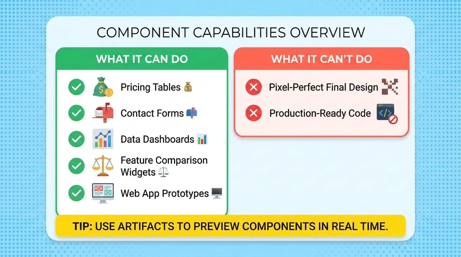 Claude can write React code and render it as interactive components through Artifacts. Think about that. It can create data dashboards, interactive calculators, styled cards, and even simple web app prototypes with actual visual design.