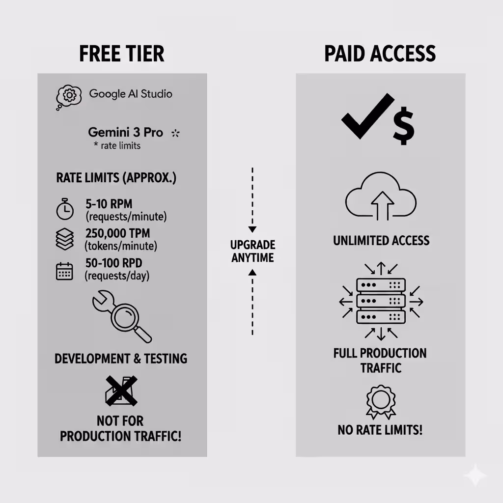 Google AI Studio gives you free access to Gemini 3 Pro with rate limits. You can prototype, test, and build small applications without paying anything.