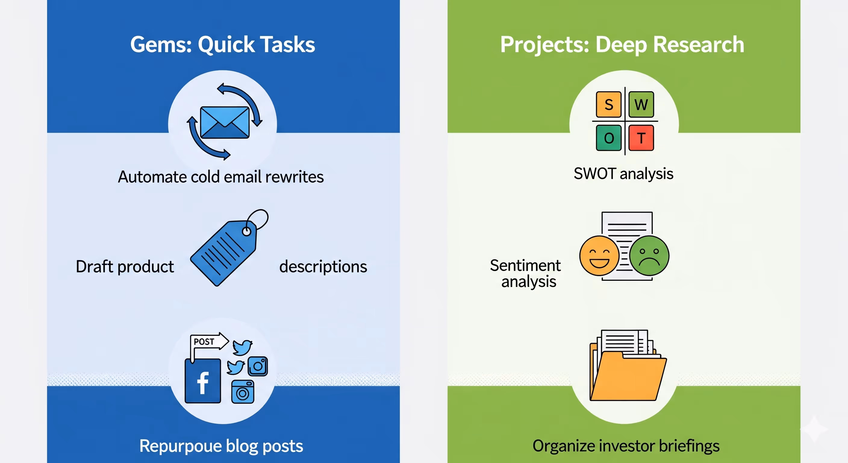 Scope: Gems are for single-task shortcuts. Projects are for full research workflows.