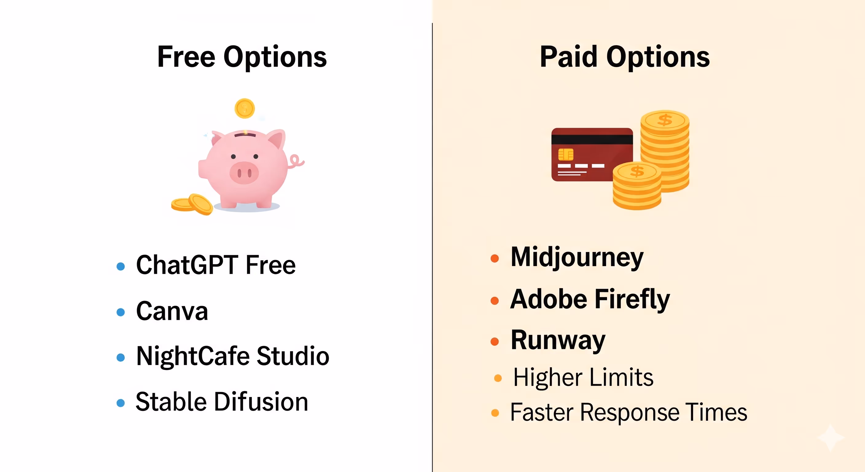 Free tiers worth trying: ChatGPT Free (limited daily images), Canva, NightCafe Studio, and Stable Diffusion if you can run it locally.