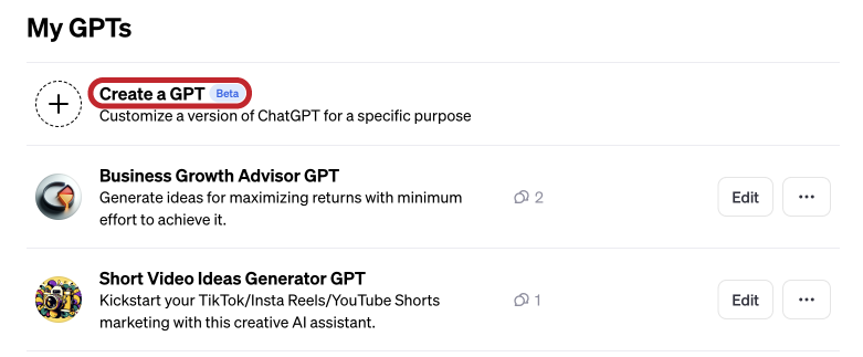 This can be easily done by navigating to the "Explore" section and selecting "Create a GPT" within the "My GPTs" area.