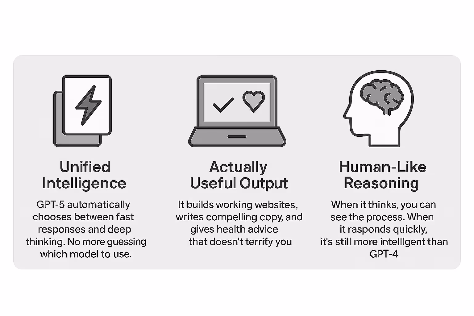 1. Unified Intelligence: GPT-5 automatically chooses between fast responses and deep thinking. No more guessing which model to use.