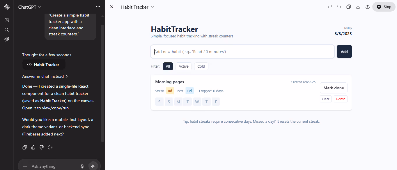 "Create a simple habit tracker app with a clean interface and streak counters."