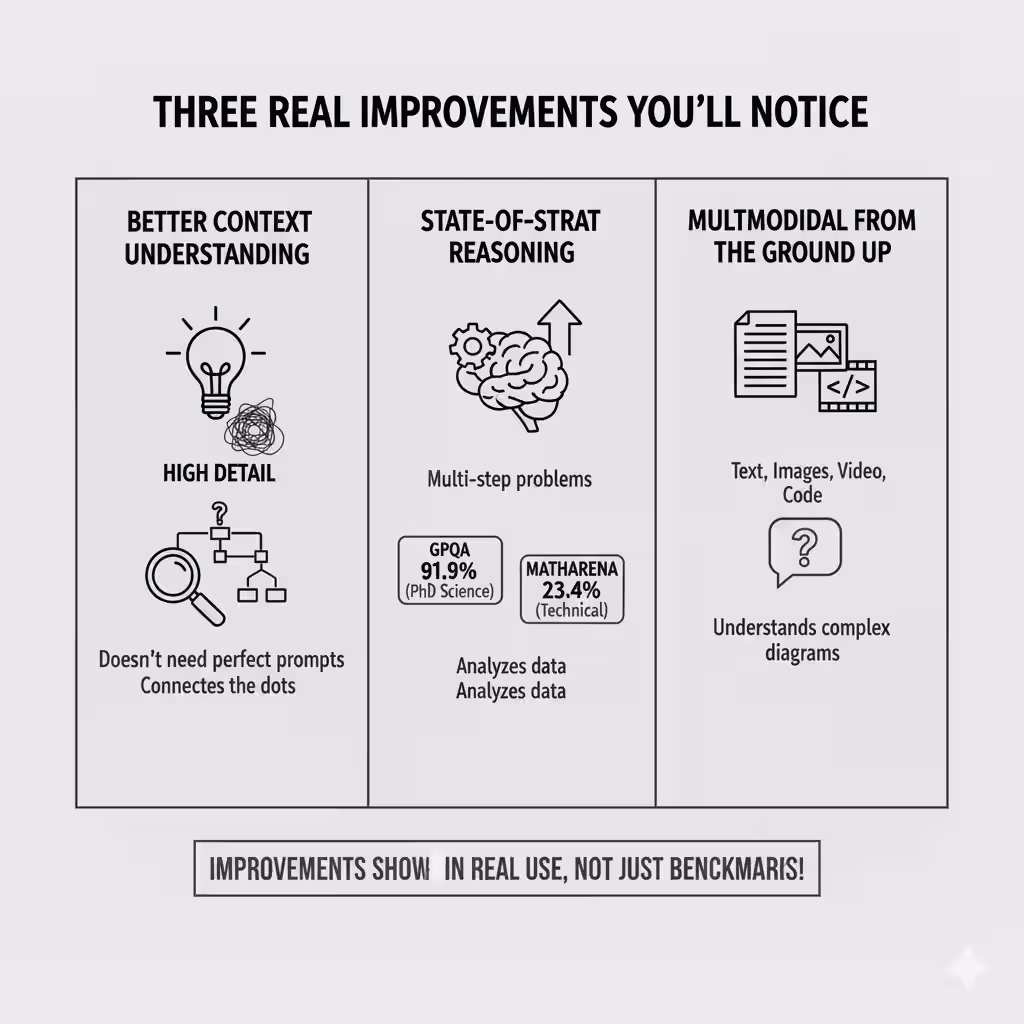 Gemini 3 represents a shift in how AI works — less prompting, smarter context understanding, and tools that actually deliver on the promise of AI assistance.