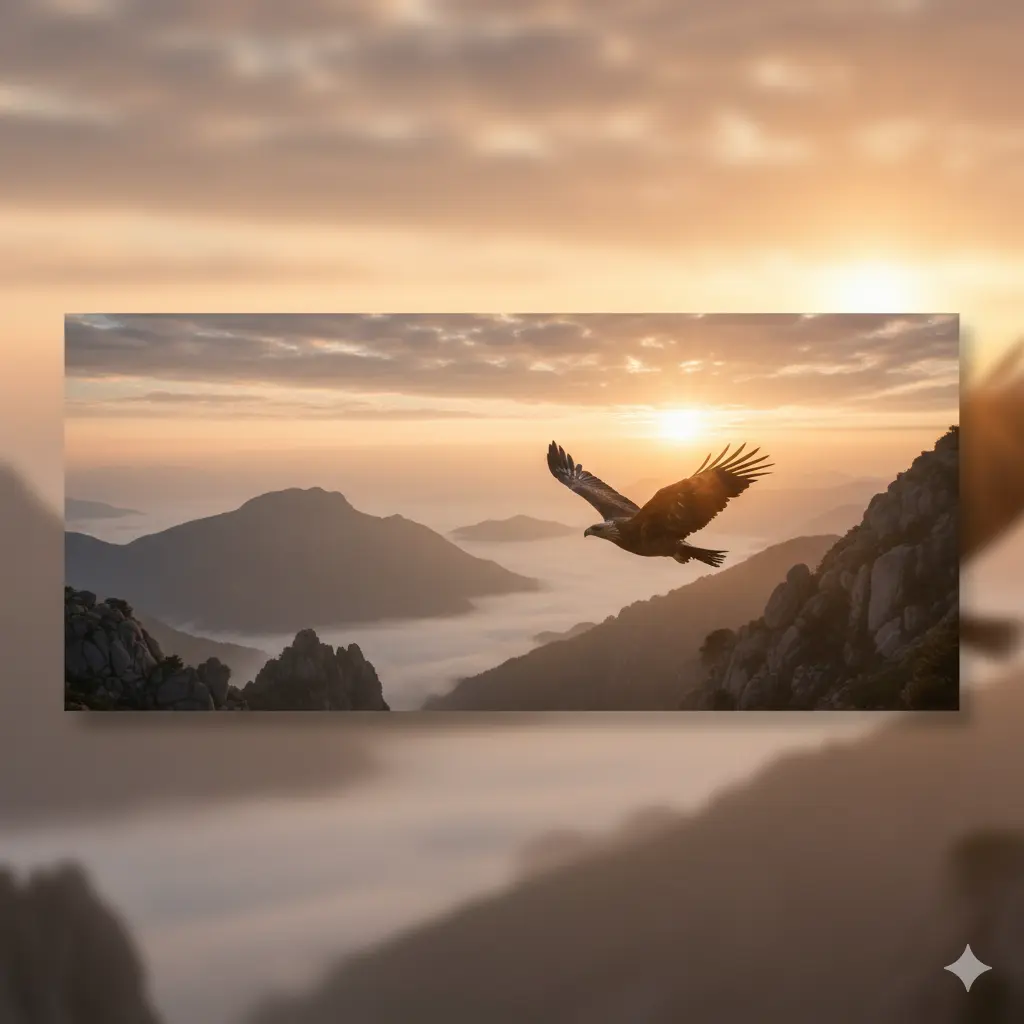 "A sunrise over misty mountains, golden light breaking through clouds, a eagle soars across the frame, gentle wind sounds and distant bird calls, camera slowly pans right following the eagle's flight"