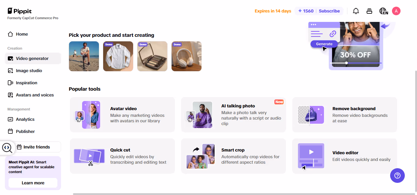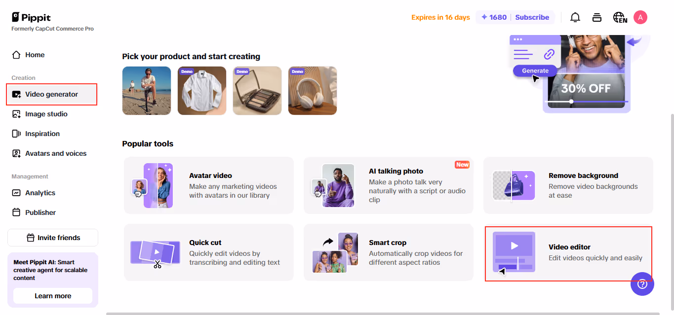First, create an account on Pippit to view its dashboard, select "Video generator" from the left-hand menu, and select "Video editor."